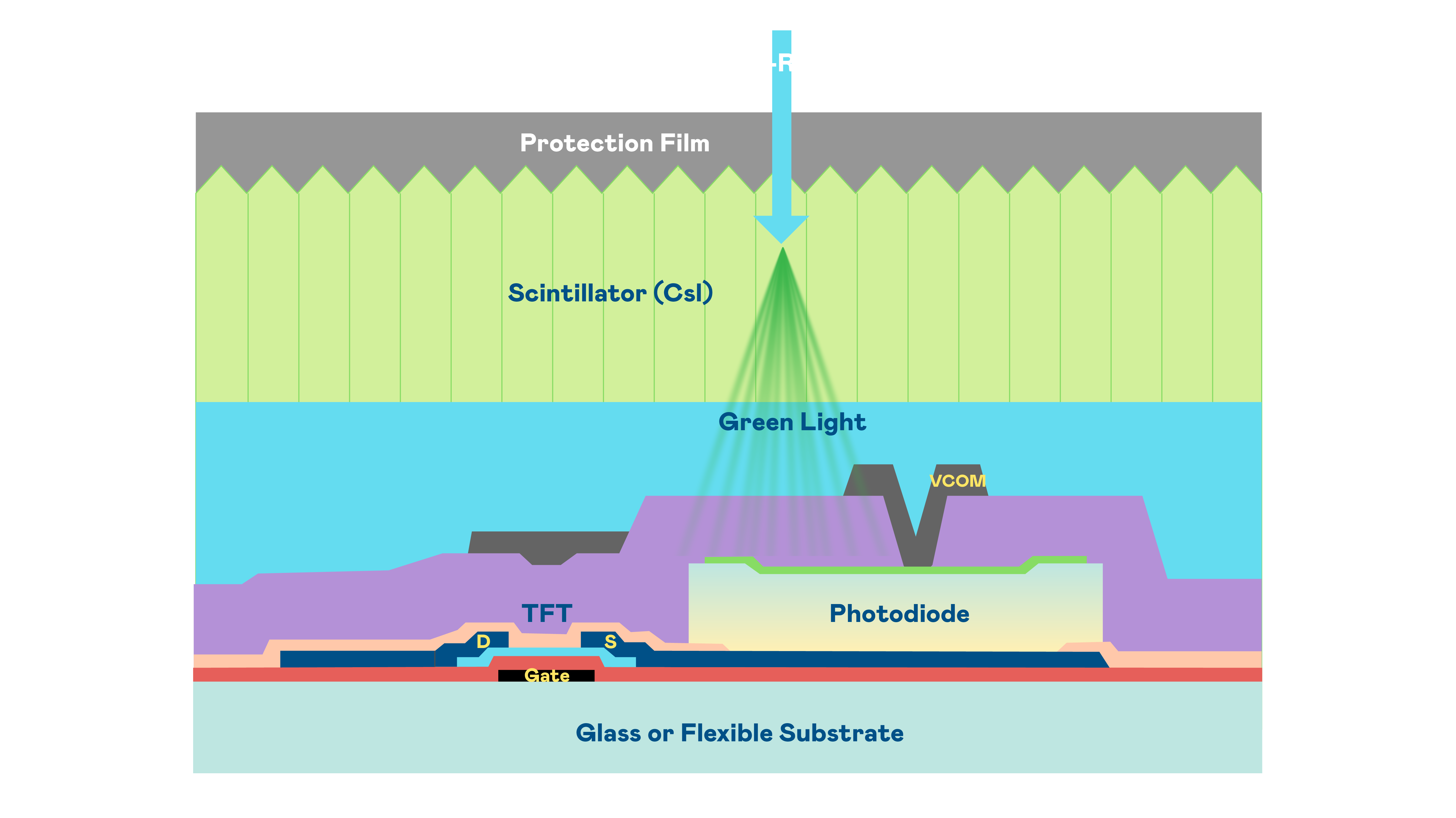 成人看片7777.tv的X光影像感测阵列使用薄膜电晶体 (TFT) 作为每个像素的读取开关,搭配光电二极体(Photodiode)的光电转换元件,用以感测X光影像讯号。